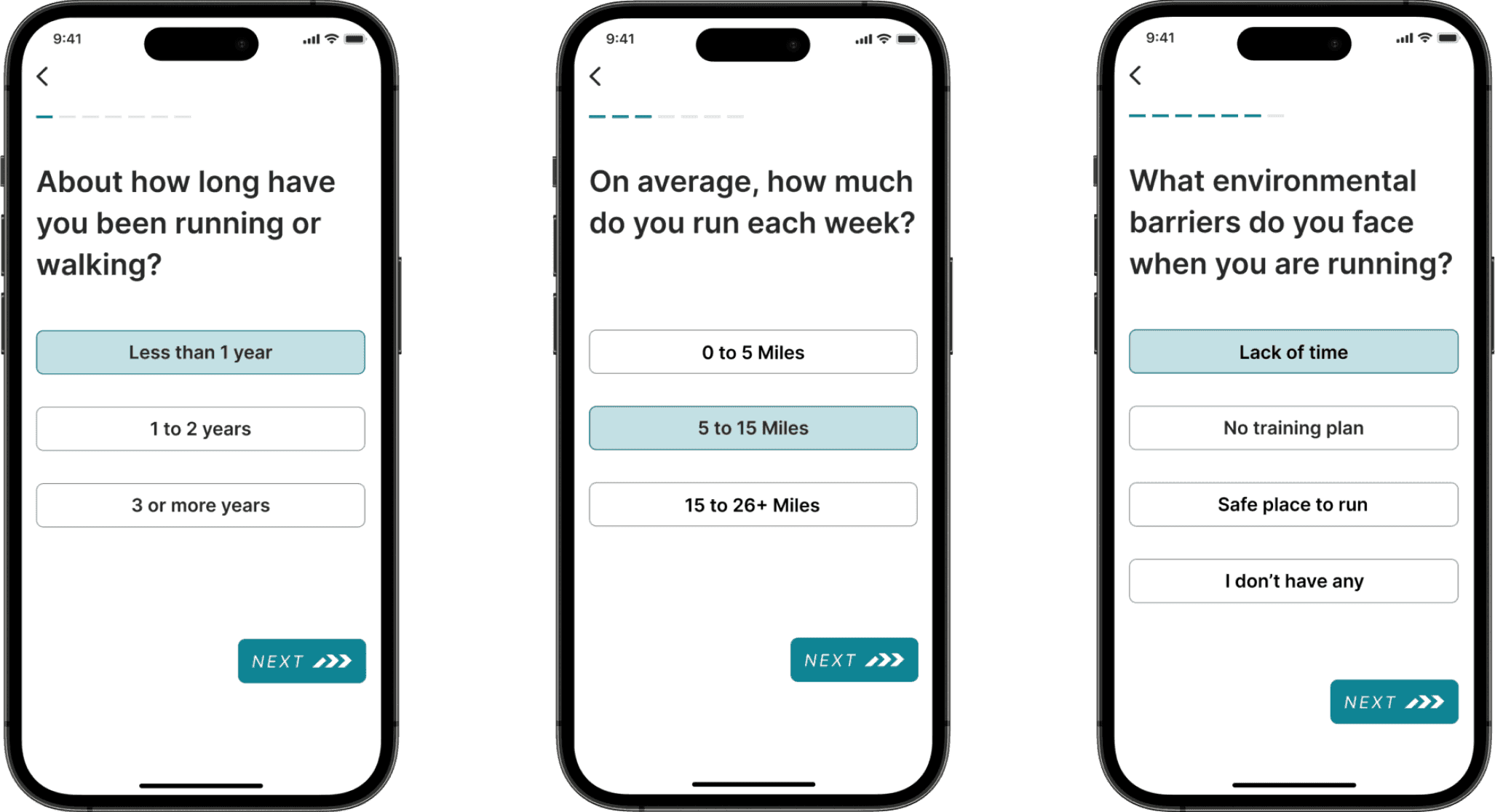 These insights provide guidance for what key features the app should focus on to help individuals overcome their personal barriers to running well (physical, environmental, and mental/emotional), as well as resources and support (both within the app, or in their community) users may want to access to increase the likelihood of being able to finish their individual race.