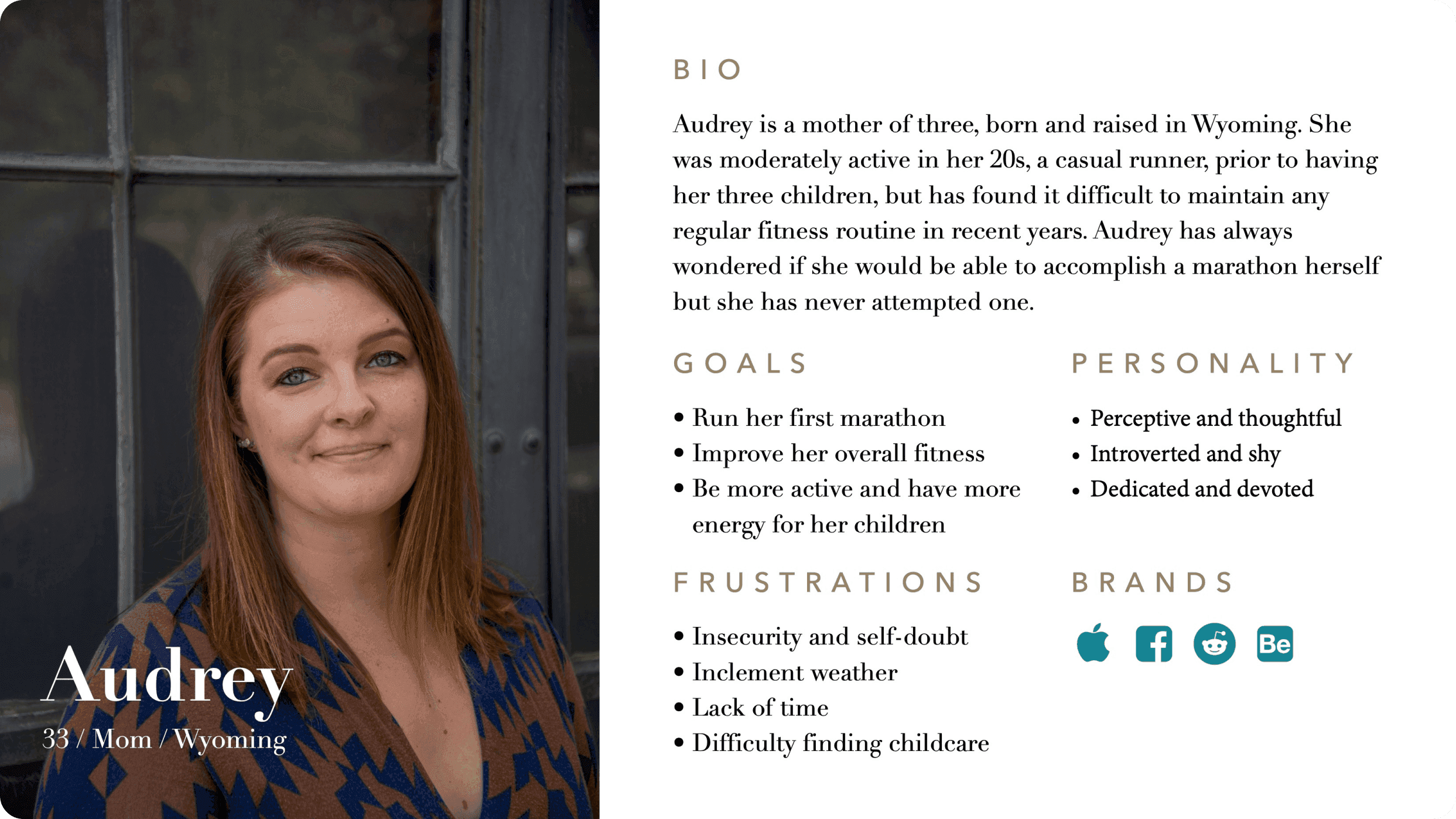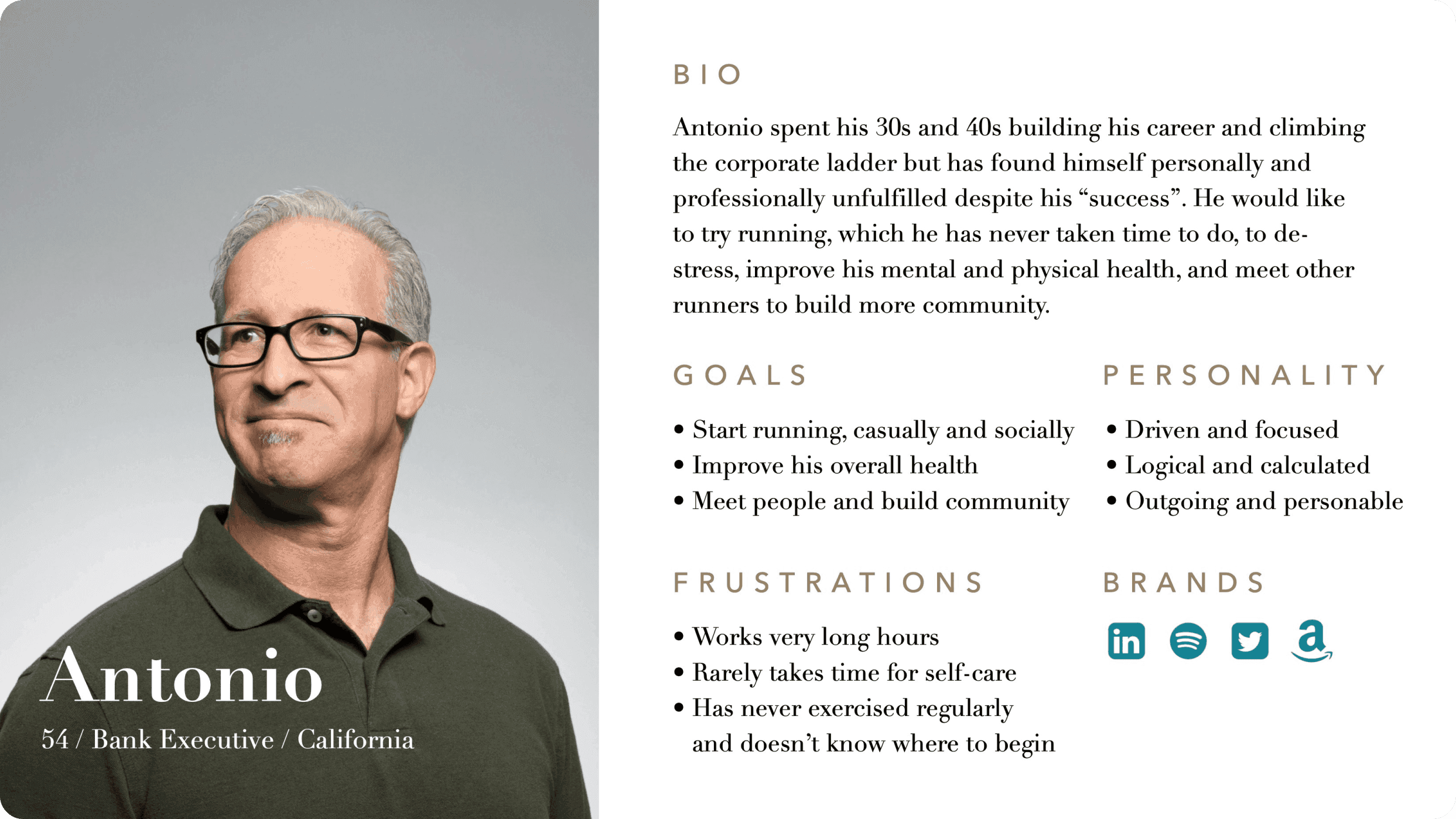 After gathering and organizing the data from my research, I needed to create personas to visualize the target user. I wanted to ensure that the personas accurately portrayed aspiring runners who wanted to start running and or finish a race. The personas were referred to throughout the entire process in order to remain focused when making design decisions.