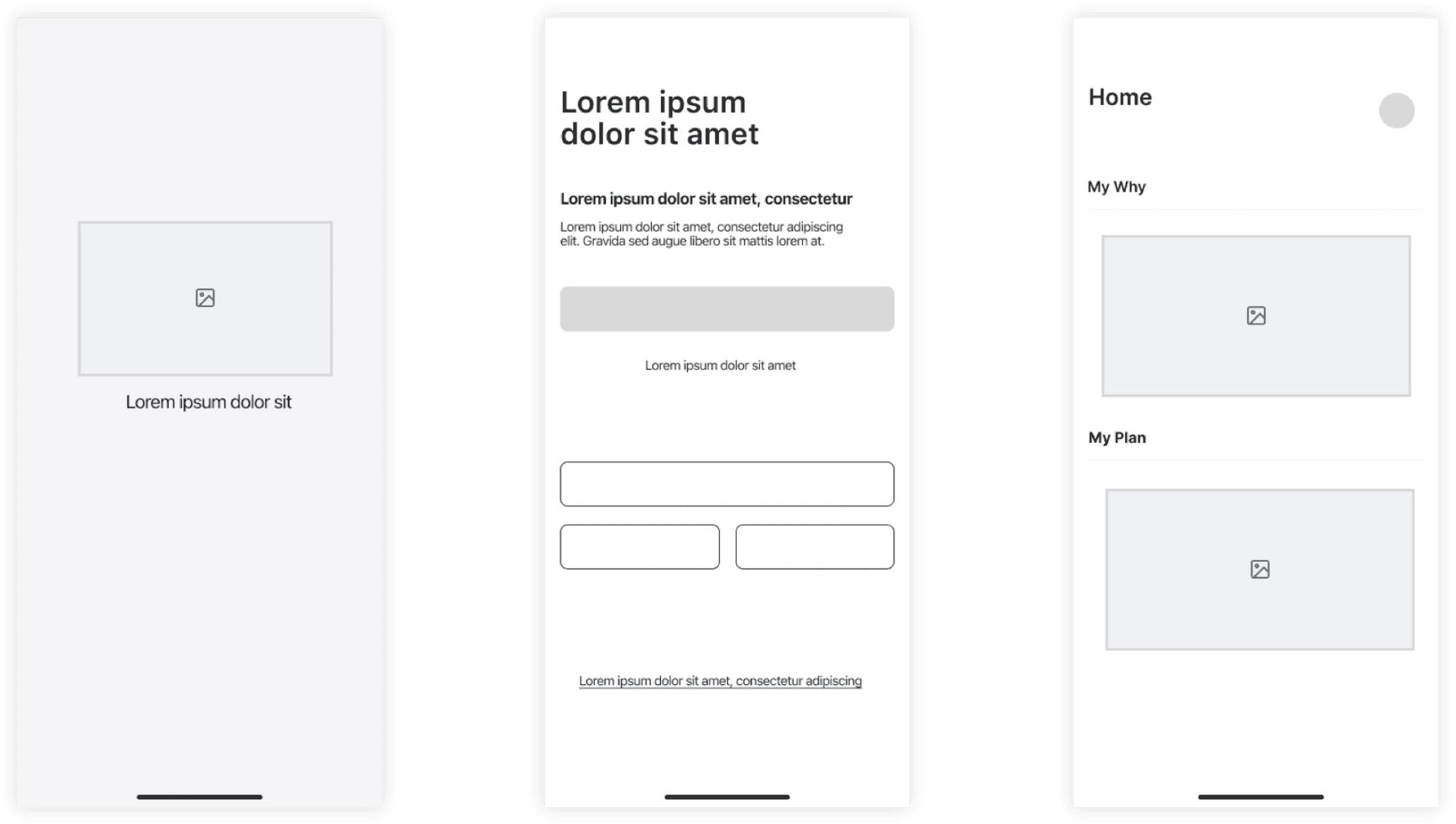 At this point in the design phase it was time to incorporate the research that I had into wireframes. To help visualize how the app should be structured, I created low-fidelity wireframes for the loading screen, initial onboarding process and also the home page in Figma.